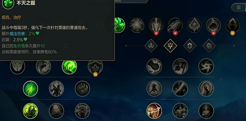 不灭之握是赖线流的核心符文选择,它能在造成伤害的同时回复血量,极大提升线上续航能力。搭配凯旋、骸骨镀层和群居猎手这套副系符文,可以让你在对线期更稳定地发育。上路兵线较长,这套符文特别适合那些前期偏弱、需要时间成长的半肉半输出型英雄。骸骨镀层能有效减少受到的爆发伤害,而群居猎手则提供了额外的生命回复效果,两者配合不灭之握的回血效果,让你在换血时总能占据优势。凯旋符文则在击杀后提供回复,确保团战中能站得更久。这套符文组合的重点就是让你能稳稳吃兵发育,不被对手轻易压出经验区。适合这套符文的英雄都有不错的成长性,比如内瑟斯、卡蜜尔这类需要安稳度过前期的战士。他们在装备成型后能发挥巨大作用,而赖线流符文正好弥补了前期弱势的缺点。需带这套符文时要把握好换血节奏,利用不灭之握的触发时机进行消耗。