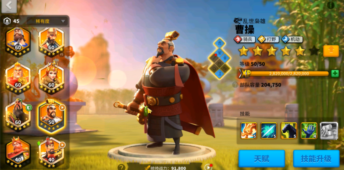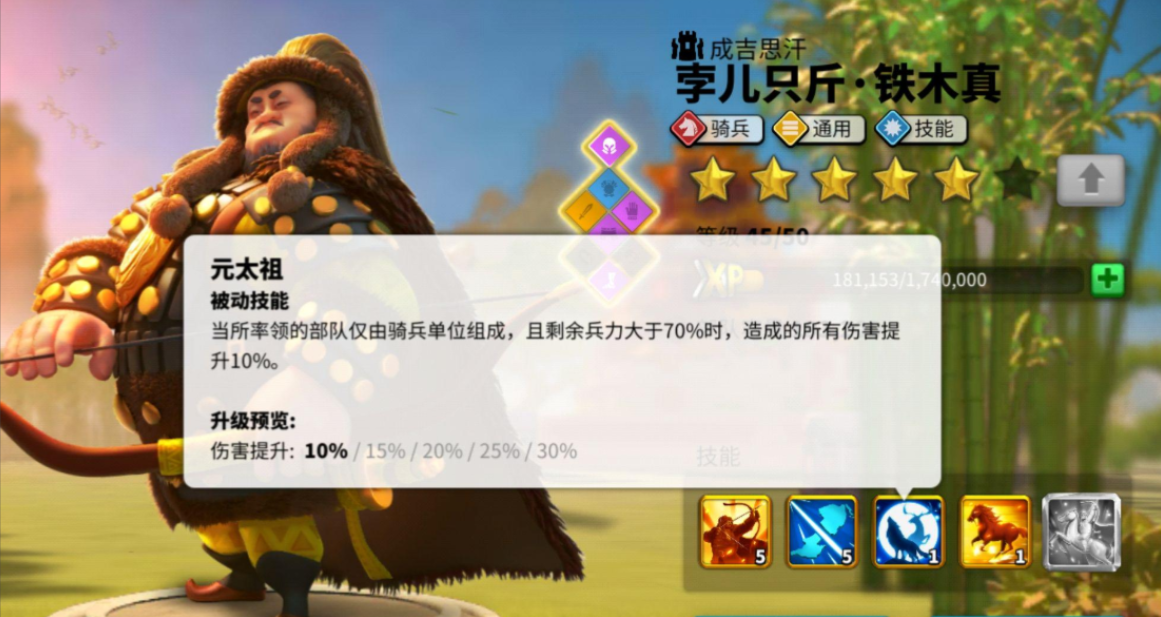 铁木真的技能设计使其成为骑兵部队的核心将领,主动技能一代天骄可对单体目标造成高额伤害,且怒气需求比其他武将少50点,这意味着更快的技能触发频率。当率领全部骑兵且兵力低于50%时,技能伤害额外增加30%,这种机制使其在残局中具备更强的爆发能力。受到攻击时还能额外获得25点怒气值,进一步强化了持续作战能力。这些特性决定了铁木真在野战和攻坚战中都有出色表现。