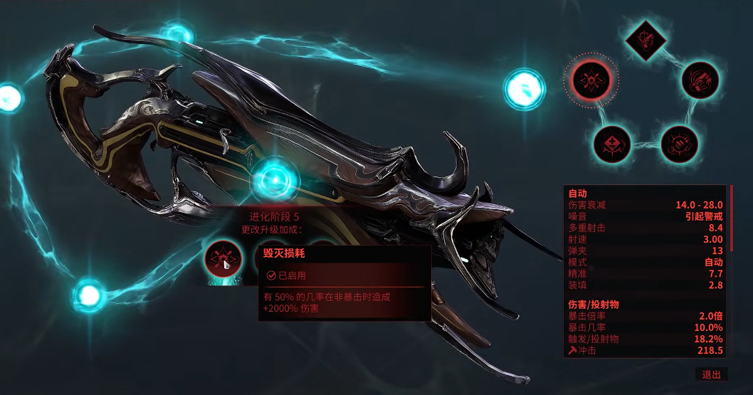 从第二阶段开始,每次进化都有三个强化选项可选。推荐优先选择提升射速的顺滑飞行和增加弹匣容量的装载动能,这样能显著改善手感。后期可以选暴击相关的毁灭之怒和毁灭损耗来强化输出。注意这些进化配置只能在卡瓦莱罗处调整,军械库只能查看不能修改。