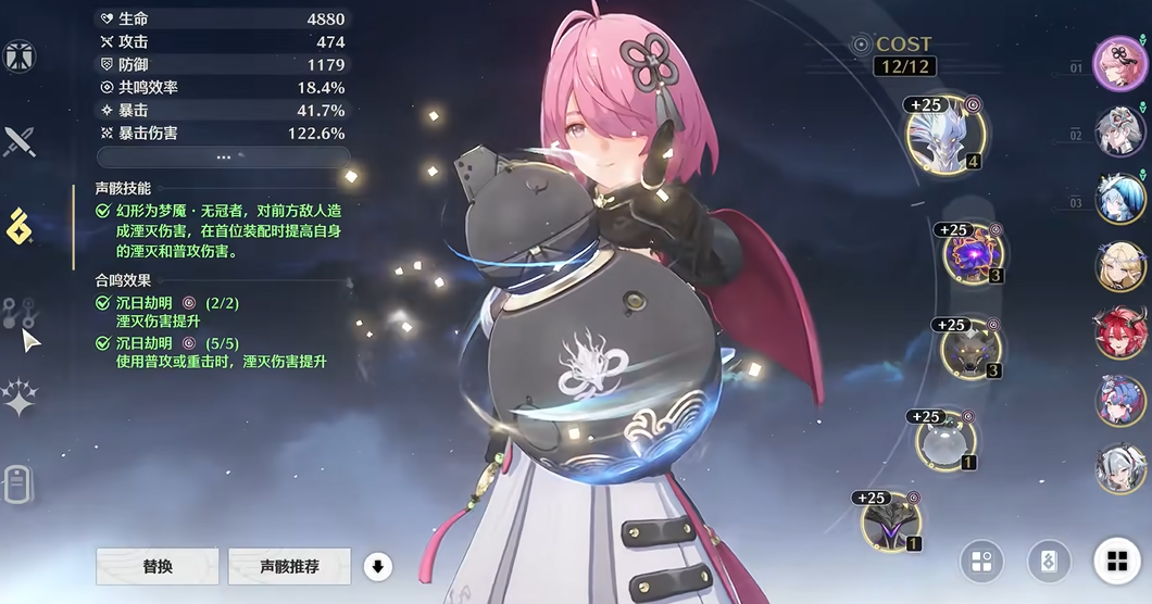 武器方面,能提供防御力加成的永夜长明是契合其机制的优选。声骸套装选择上,后期成型推荐能显著提升团队输出的辅助向套装,其两件套效果提供共鸣效率,五件套效果则在使用延奏技能后提升下一位登场角色的攻击力。声骸的各个部位主词条应优先选择防御力。