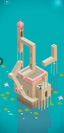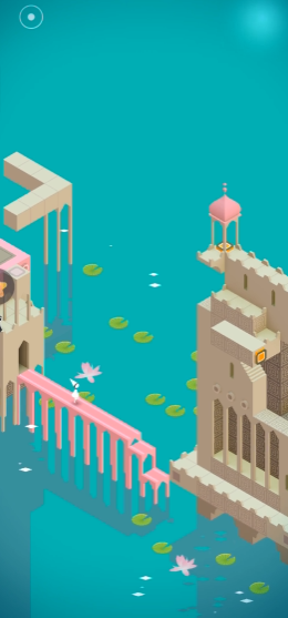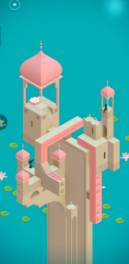 之后再次移动模块把小路移动到门口,点击艾达进入门中转换到另一座城堡。在新场景中让艾达跑到中间的按钮处,路线会再次改变下方出现粉红模块。玩家需要滑动机关让楼梯连接在一起,并让艾达去踩下按钮,道路会进一步变化露出可移动的粉色部分。小心移动粉红模块不要幅度过大,将断口和另一边的口连接起来,点击艾达跑到最上方的按钮再次转换场景。