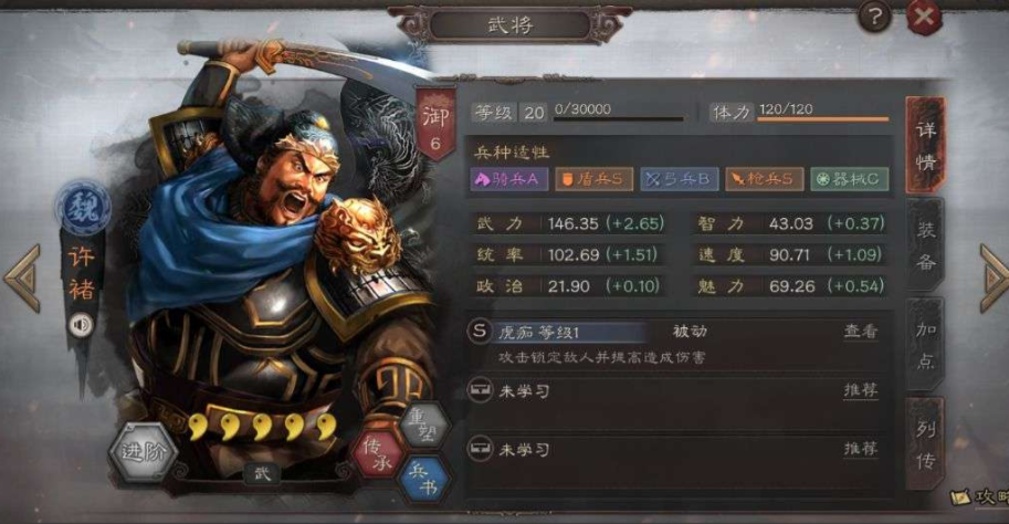 玩好典韦,加点、战法和兵书的选择是关键。因为他的主要任务是抗伤害,所以属性加点应该优先考虑统率,这样可以让他更耐揍,其次再考虑加点武力来提升一点反击伤害。至于智力短板确实存在,但可以通过阵容搭配或装备来稍微弥补,这不是他优先要考虑的。在战法学习方面,典韦可以说是反击流的专家,携带后发制人、气凌三军这类受到攻击就反击的战法,能让他挨打的同时输出不俗的伤害。为了站得更久,带上合军聚众、自愈这类自带回复的战法也非常实用。兵书则可以选择守而有道、铁甲等进一步提升生存能力的选项。