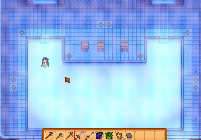 找到浴室,进去之后怎么用呢?它的核心功能就是泡澡恢复。走进对应性别的浴室后,右侧就是一个温暖的池子。你只需要控制角色走进池子,然后站着不动,角色就会开始泡澡。在这个过程中,屏幕上方你的体力值和生命值(如果你在矿洞里受伤了)都会以一个比较快的速度持续恢复。这简直是前期工具等级低、体力经常不够用的救星,比早早回家睡觉要划算多了。如果你在池子里来回走动,恢复效果是不会触发的,必须静止待着才行。浴室旁边的空地上还有一个小池塘,平时可以在那里钓钓鱼,但到了冬天池塘会结冰,就没法钓了。