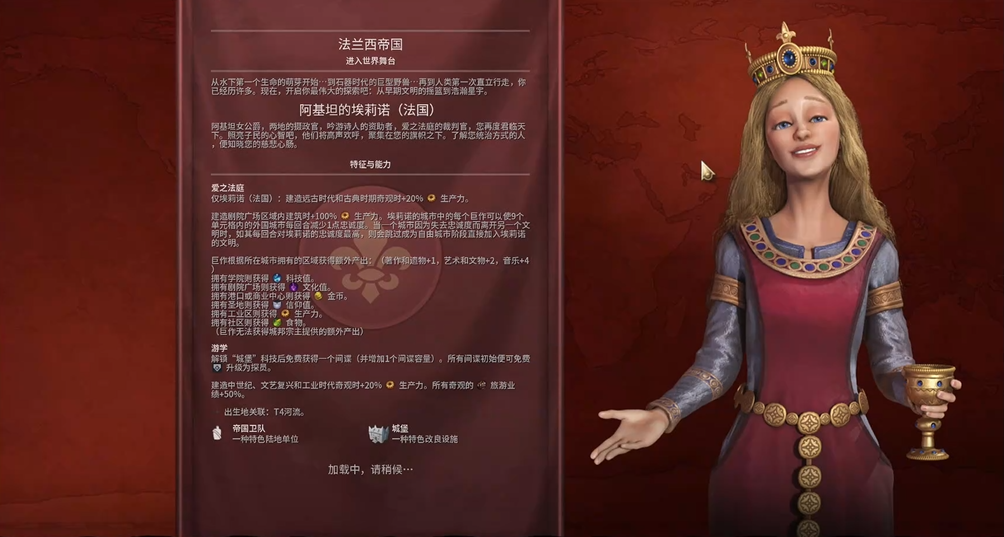 在游戏中选择阿基坦的埃莉诺领导的法国,核心是体验其独特的爱之法庭能力。这个能力允许你通过文化影响力而非军队来征服世界。其机制在于,你所拥有的每一个巨作(包括大作家、大艺术家、大音乐家创作的著作或艺术品),都会对9个单元格范围内的所有外国城市施加持续性的忠诚度压力,每回合减少1点忠诚度。当一个外国城市的忠诚度降至零时,如果对你的文明忠诚度最高,它将跳过自由城市的阶段,直接加入你的帝国。这创造了一种名为无战征服的胜利路径,你无需正式宣战,就能像磁石一样不断吸附相邻文明的领土,最终通过和平手段赢下征服胜利。