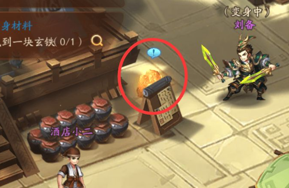 玄铁的精确位置是在地图上的酒店区域。当你到达这个区域后,首先找到站在酒楼门口的店小二NPC,然后往他的右侧移动,那里摆放着好几个酒坛子,旁边有一个立着的木牌,玄铁就藏在这个木牌的背面。虽然木牌本身看起来不太显眼,但靠近后玄铁散发的金光会非常醒目,直接点击就能完成收集。