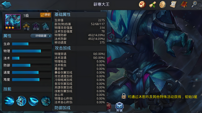 辟寒大王作为妖族近战控制型英雄,凭借冰冻和嘲讽技能成为战场上的多面手。他的核心优势在于一技能透心冰寒能冻住敌人并形成冰墙减速,二技能寒意主宰可嘲讽敌人并提升自身普攻伤害,三技能斧光寒域则能制造大范围寒冰风暴并附带强控效果。觉醒后普攻附带多倍伤害,对残血敌人有斩杀能力。这种技能组合让他在对战中既能打乱敌方阵型,又能为队友创造输出空间。
