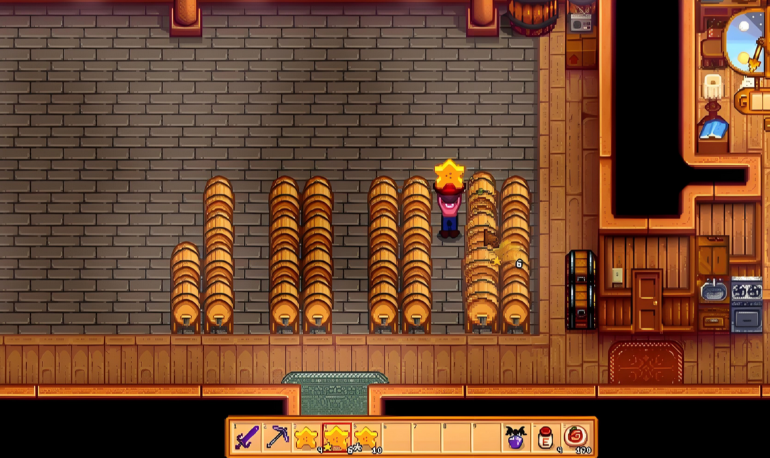 酒窖的解锁前提是将农舍升级至三级(包含婴儿房),随后花费10万金币委托木匠罗宾扩建。扩建完成后,地窖位于厨房下方,初始自带33个陈酿桶,玩家可自行制作更多桶以扩大产能。需注意陈酿桶仅在地窖内生效,放置在外部无法发挥熟成功能。熟成周期因酒类而异,例如果酒需56天达到铱星品质,而啤酒仅需28天,合理规划酿造顺序能最大化收益。