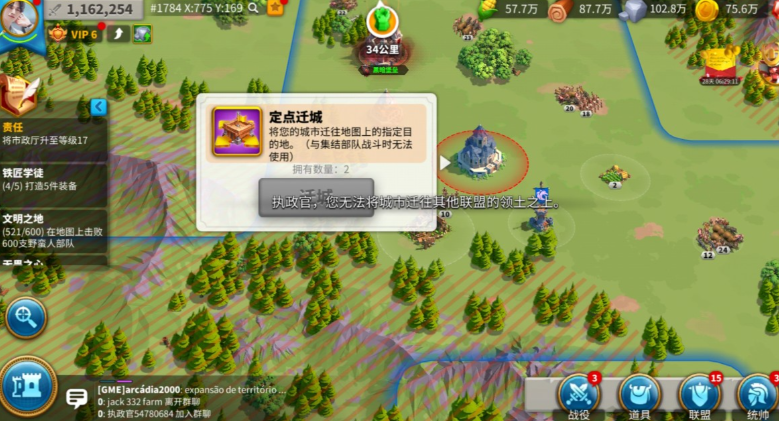 对于主城等级较高的玩家,新手迁城道具无法使用,需依赖联盟要塞建成后的领土迁城功能。加入联盟后,在联盟占领区域内选择空旷位置,点击迁城并确认地块显示为绿色即可完成操作。需注意树木、野怪等障碍物会占用迁城空间,提前清理或选择无遮挡区域能提高成功率。