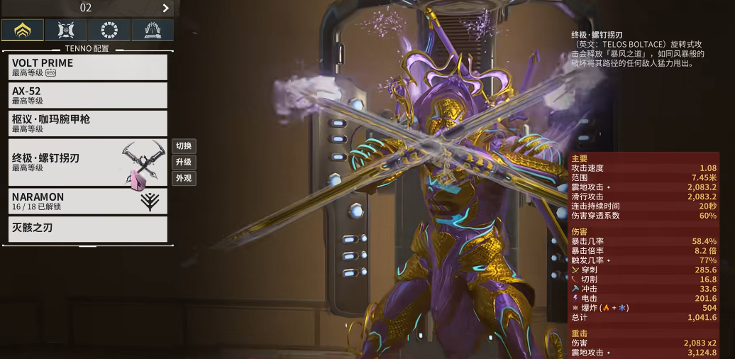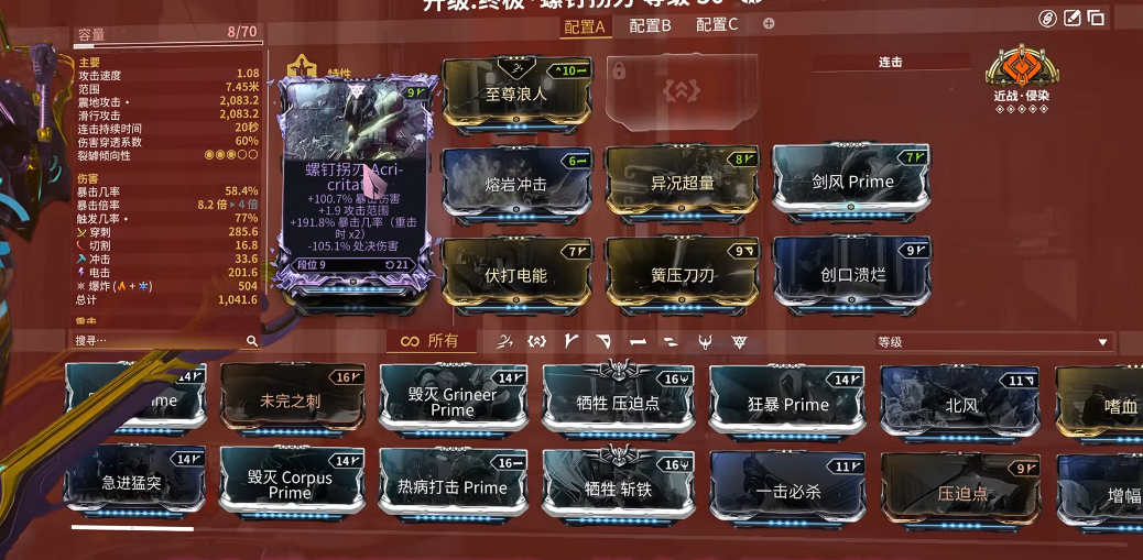 配卡方面推荐走纯暴击路线,利用滑砍六倍伤害的特性快速清怪。基础MOD搭配以压迫点、肢解为主,配合狂暴Prime提升攻速。如果追求持续输出,可以加入狂暴化或生命打击保证生存。注意平原任务中尽量避免切出近战形态,直接用划砍触发被动会更好用,否则可能把怪物弹飞到地图外。