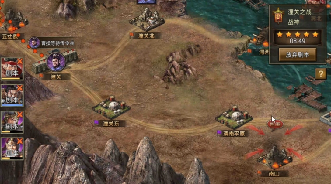 突进至河西的武将应立即撤退至潼关北并补满兵力,同时派太史慈前往长安刷五个影子拦截马超。另一武将则攻打潼关东,刷一个影子后等待支援。渭北平原事件触发后,需及时将曹操调往潼关东,确保其安全撤离路径畅通。复活的武将应迅速支援潼关东战场,形成夹击之势。