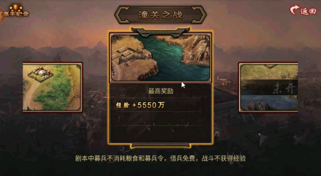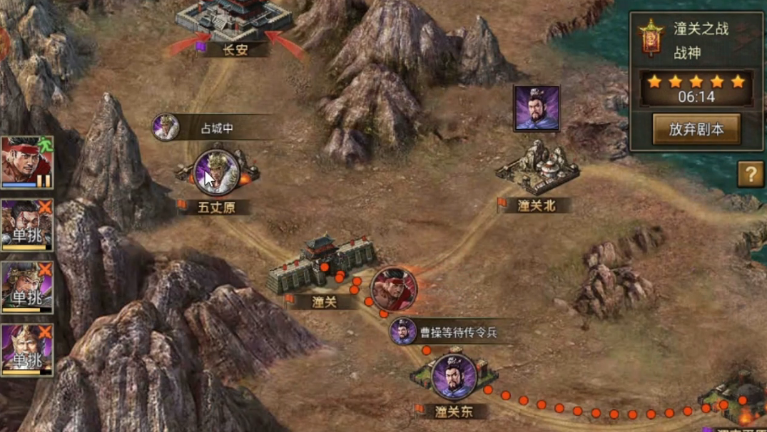 潼关之战剧本的核心在于合理分兵与精准控制曹操行进路线。开局需将全部武将集结在渭北平原,留一名武将操作传令兵,其余三将突进至渭北单挑并刷一个影子。打下渭北平原后立即处理事件,将曹操派往潼关以防马超追击。马超初始等级为130级,每通过一座城池降低5级,建议在其降至110级时集中火力击败。