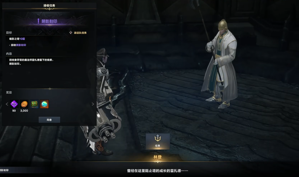 前往暗影之塔前,玩家需确保已完成前置任务阴影刻印。该任务由象牙塔法师莱吉德触发,要求玩家进入暗影之塔24层回收特定道具。任务描述会明确指引玩家返回女王城寻找塔的位置。如果尚未接取该任务,可先前往暗影岛探索触发。任务奖励包括银币、和谐碎片、守护石等资源,对角色成长有较大帮助。