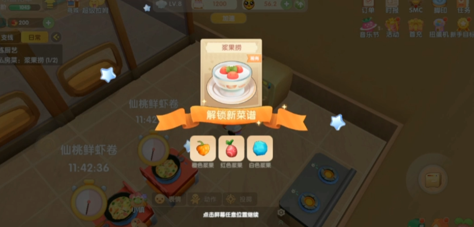 材料齐全后,你可以去餐厅的厨房开始制作,打开烤箱或烹饪菜单,找到浆果捞的食谱选项。接着放入材料,将火力调节到中火或大火,然后点击开始按钮,烹饪时间大约需要1分钟。完成后,浆果捞会进入保温状态,保温时间大约是5分钟,这时最好及时出售或使用,以保持最佳状态和收益。