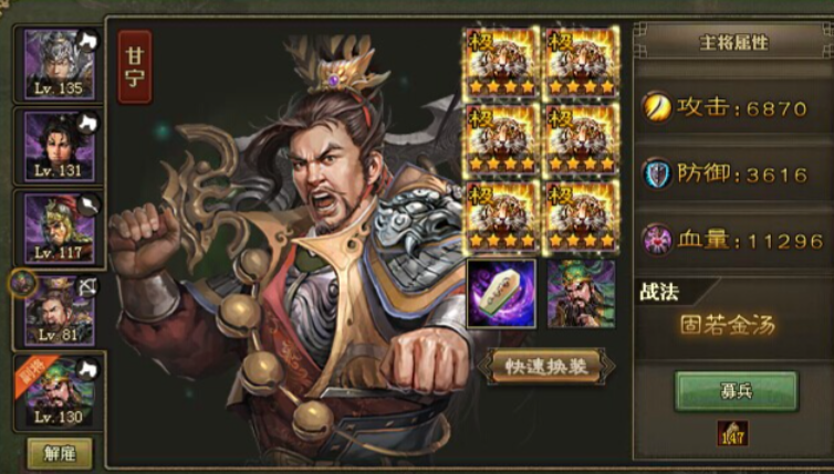 光有司马懿一个人可不行,整个队伍得围绕他来搭建。夏侯渊在这个阵容里可以不用觉醒,但他的装备选择有门道,最好配上白刀和白鞋来增强自身的防御,同时开启火车技能,这个技能能有效减少被敌人破甲的次数,对于维持战线稳定很有帮助。甘宁、周泰和关羽这几位则是队伍里的火力担当和坚实壁垒,他们都得完成觉醒。甘宁最好配凤凰套装和白刀、绿鞋,他的目标是在战斗中尽可能多地释放战法;周泰则需要灵龟套装和白刀、黄鞋来快速叠加护甲,硬抗伤害;关羽则依赖烛龙技能和双白刀的配置来打出爆发。