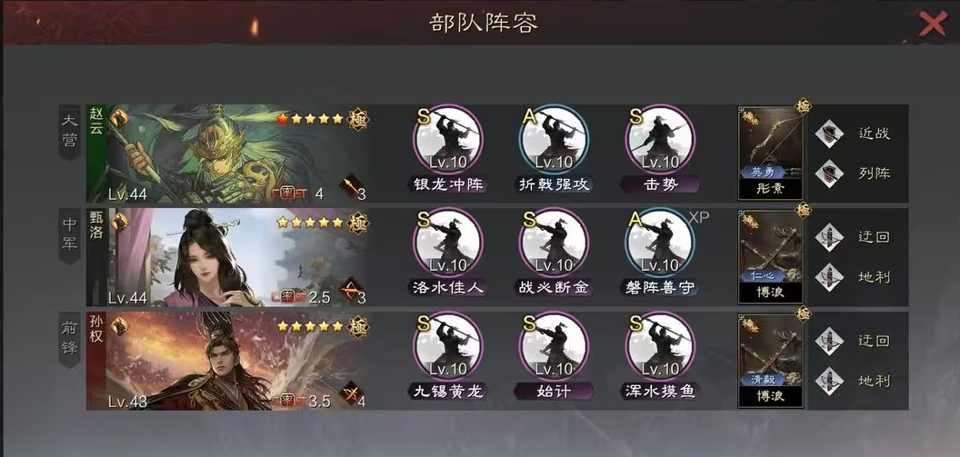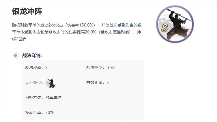 赵云的自带战法银龙冲阵是其固有的核心输出手段,无需玩家额外获取或消耗资源。该战法拥有较高的发动概率,可以对敌军单体造成递增伤害,并附带受攻击属性影响的增伤效果。由于是赵云初始携带的技能,玩家在获得武将时便自动拥有这一战法,为其提供了稳定的输出基础。自带战法的特性使得赵云在无需额外配置的情况下也能发挥一定作用,但为了最大化潜力,通常需要搭配其他战法来适应不同战斗场景。