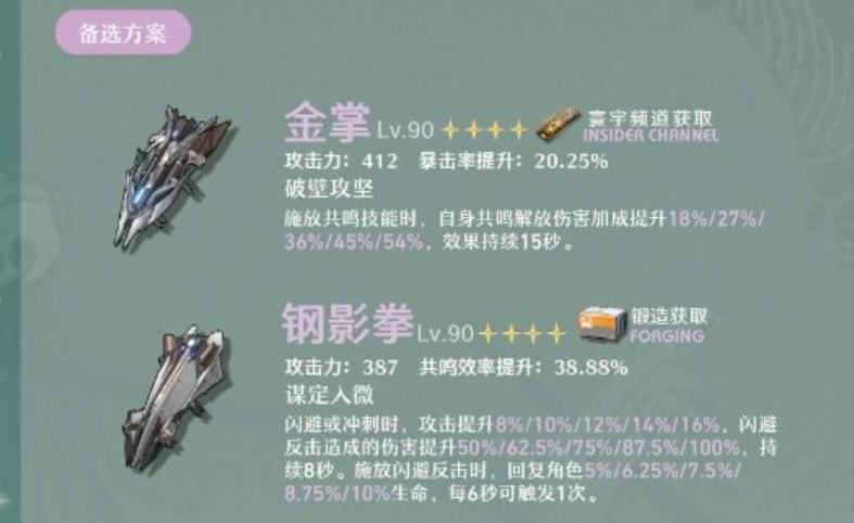凌阳的专武擎渊怒涛具备587攻击力白值与36.4%攻击加成,特效可同步提升普攻与共鸣技能20%伤害。其共鸣效率增益进一步优化技能释放频率,使输出节奏更流畅。若无专武,金掌的暴击率词条与54%共鸣解放增伤能适配速切爆发打法。钢影拳虽为锻造武器,但38.88%共鸣效率与闪避反击强化效果,在低配队伍中表现稳定,尤其适合操作熟练的玩家。