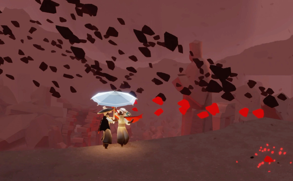 当你献祭完第一区域的石头人,就会进入后半段,这里的红石雨变得密集且持续不断,危险系数大幅增加。在这个阶段,移动时有几个关键技巧:尽量避免跳跃或飞行,因为很容易被砸倒;可以尝试斜向或者横向移动,而不是直接逆着风走;如果不慎被砸倒,要立刻起身继续前进,不要停留。目标是尽可能多地将自己的光之翼献给沿途的石头人,直到所有的光之翼消耗殆尽。