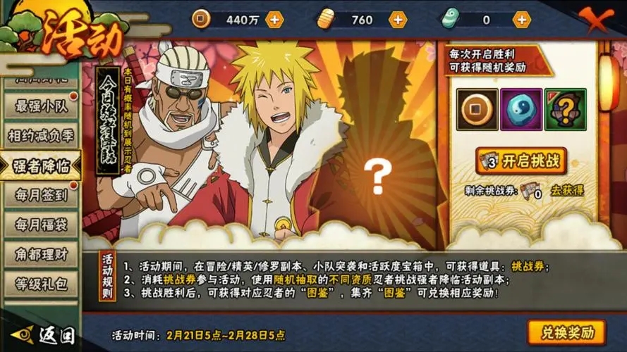 资源管理是游戏推进的核心根基,金币需集中用于高级招募忍者与每日前三次体力购买,拒绝浪费在非高招招募与商城低价忍者碎片上。每日活跃度务必拉满至100点,稳定获取金币、高招券与忍玉等关键道具。体力优先用于主线副本与精英副本,前者快速升级解锁玩法,后者获取忍者碎片与装备材料。小队突袭每日开启三倍奖励,高效获取忍玉与声望,用于通灵与装备强化。丰饶之间的历练、赏金、声望副本每日次数刷完,保障经验、铜币与声望的稳定供给。生存挑战尽力通关更高关卡,在商店兑换凯等强力忍者碎片与轮回石,助力前期战力提升。