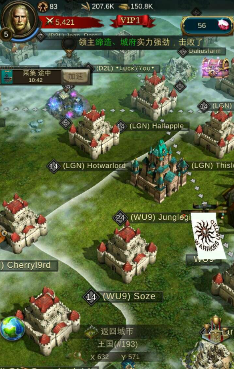 联盟是王国新征程的核心支柱,尽早加入活跃联盟,借助联盟互助加速建筑升级,共享联盟科技与领地buff,大幅提升发展效率。联盟成员协同占领地图要塞、资源区,参与联盟副本与领土战,集结兵力攻克强敌,分享战利品与占领收益。王冠争夺战是联盟核心博弈,分夺冠与守冠阶段,联盟需协同攻占王城周边八座塔楼,成功占领后坚守五小时即可加冕,掌控王城获取专属特权与全联盟增益,守冠时合理布防,搭配滚木、哨所等防御设施,抵御敌方联盟反扑。
